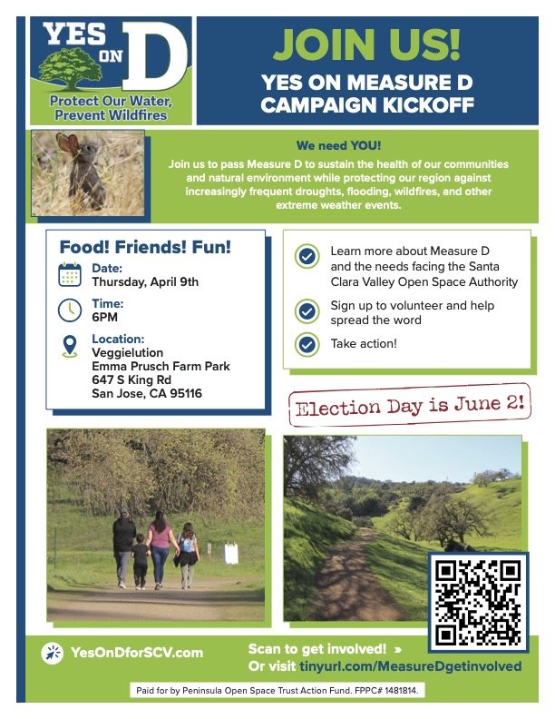 Measure D will be on the ballot in June and it is imperative to making sure the Open Space Authority can continue to steward and protect vital land in Santa Clara county!!