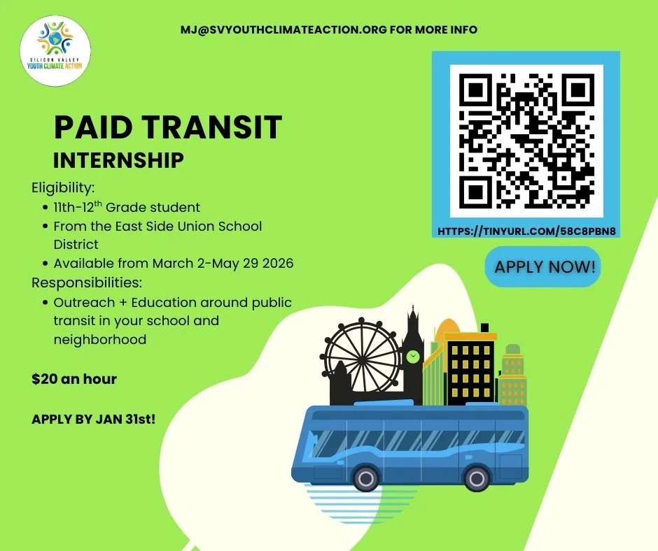 Silicon Valley Youth Climate Action has a paid internship opportunity open to 11th and 12th grade students in the East Side Union High School District.