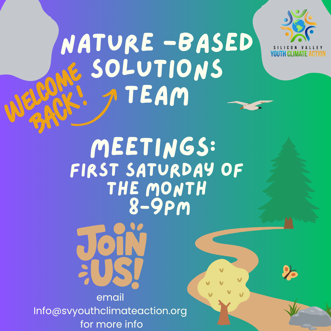 SVYCA Nature Based Solutions is a youth-led initiative focused on promoting and taking actions that protect and restore ecosystems while also benefitting social and economic systems. The mission of the Nature-based Solutions Team is to educate about, advocate for, and implement land-based projects that effectively mitigate and adapt to the effects of climate change, support the health, biodiversity and expansion of the Bay Area's ecosystems, and serve the needs of local communities. We host monthly meetings to learn and take action together. Join us at our next meeting!